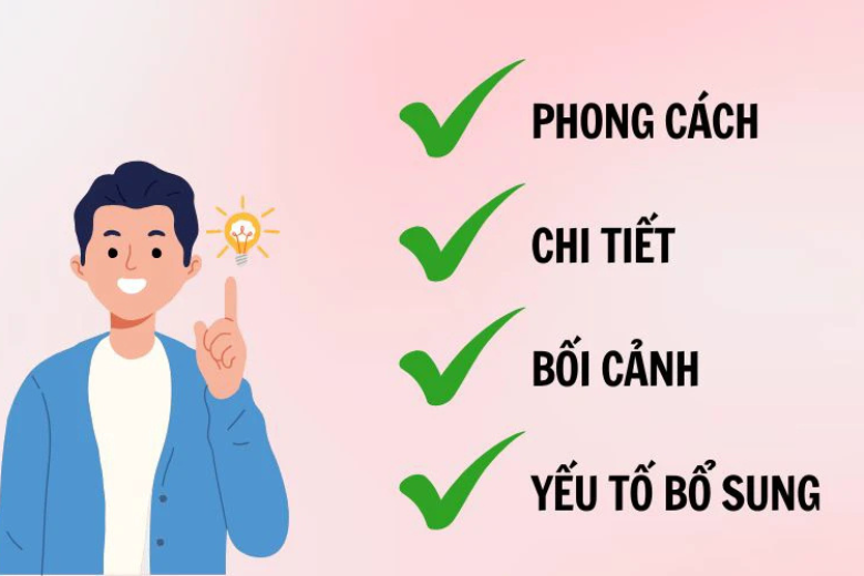 Chi tiết nhân vật: Người dùng nên mô tả cụ thể về hình dáng, trang phục, biểu cảm, tư thế và mọi phụ kiện liên quan đến nhân vật hoặc đối tượng chính.