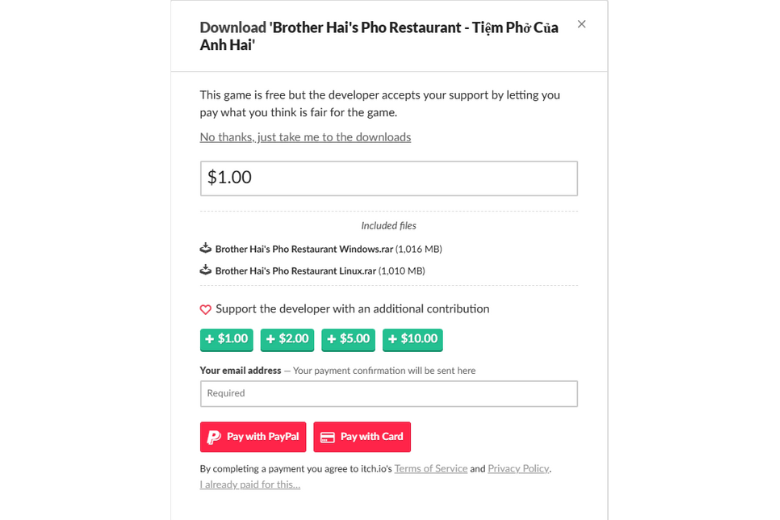 Bước 1: Bạn cần truy cập vào đường link chính thức của game trên itch.io tại: https://marisa0704.itch.io/brother-hais-pho-restaurant.