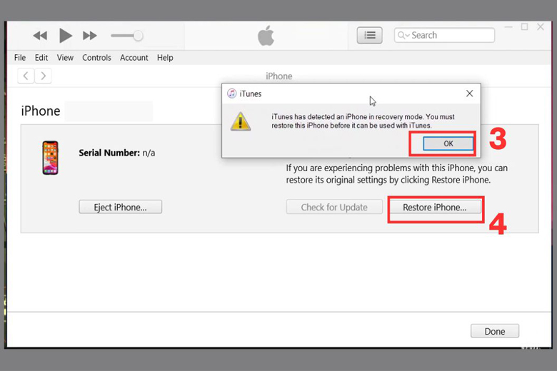 Khi iTunes hoặc Finder báo phát hiện iPhone ở chế độ khôi phục > Nhấn vào “OK” và chọn “Restore iPhone” để khôi phục.