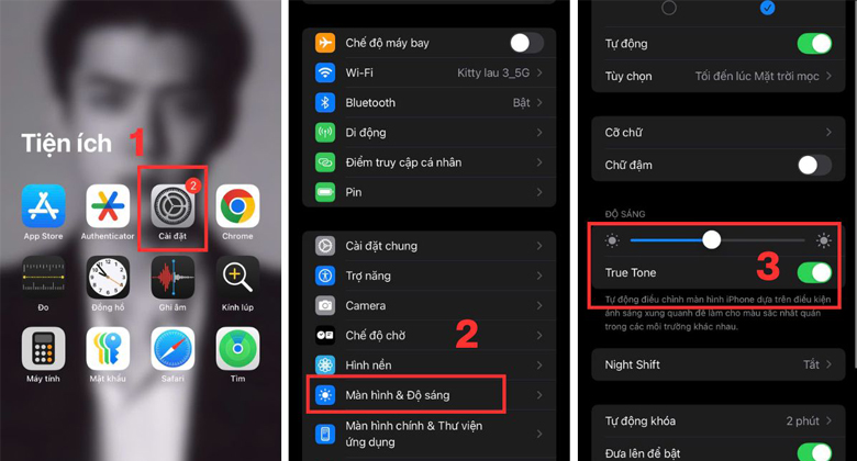 Cách tốt nhất bạn nên chọn off những tính năng liên quan đến độ sáng của máy để xem lỗi màn hình xanh có được khắc phục hay không. Cách làm như sau: Mở phần Cài đặt trên iPhone > Chọn tiếp vào mục Màn hình & Độ sáng > Chọn tắt tính năng True Tone và Độ sáng tự động.