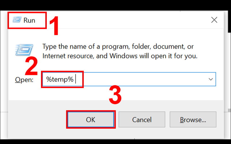 Thao tác: Nhấn đồng thời phím Win + R > Sau đó gõ %temp% > Tiến hành chọn tất cả và xóa.