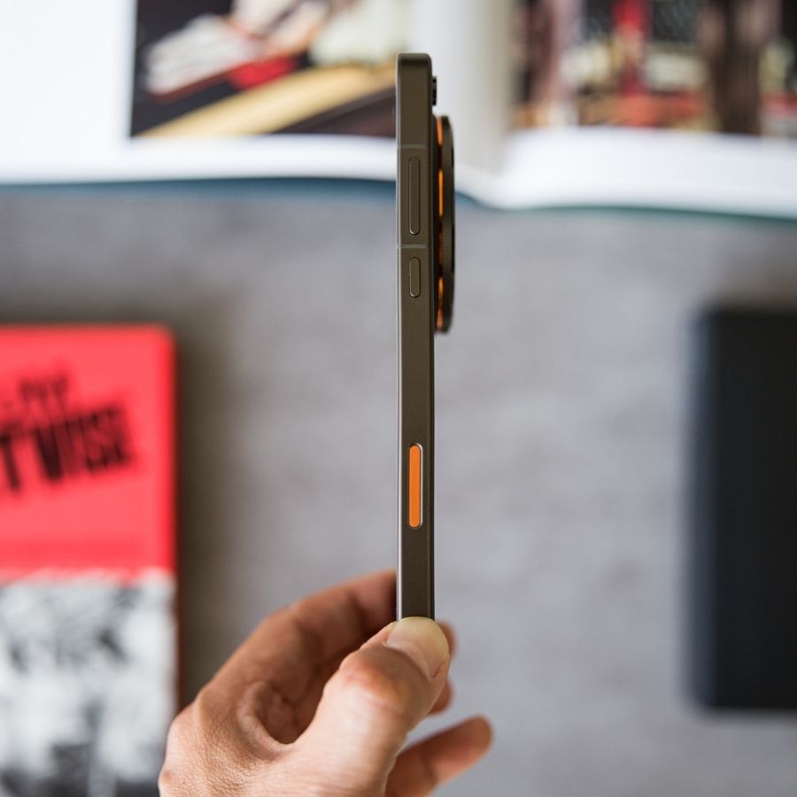 Khung kim loại hoàn thiện nhám kết hợp cùng mặt lưng da khiến tổng thể máy có chiều sâu rõ rệt. Khi cầm, mình không có cảm giác đây là một chiếc điện thoại mỏng nhẹ thông thường, mà giống như đang cầm sản phẩm chuyên dụng.