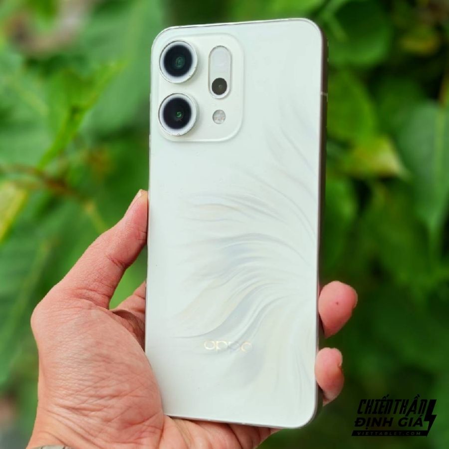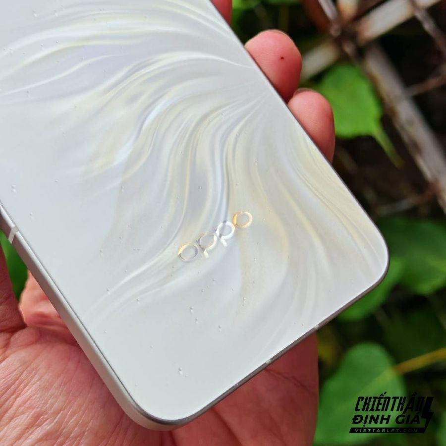 Ngôn ngữ thiết kế của điện thoại khá vuông vức, viền được bo cong nhẹ ở điểm tiếp giáp giữa mặt lưng và khung viền nên cầm không hề bị cấn tay. Oppo vẫn giữ được “chất” thời trang quen thuộc với mặt lưng kính nhám, chống bám dấu vân tay và đặc biệt là hoạt tiết “đuôi cá” đổi màu theo góc nhìn. Mình đang sử dụng phiên bản màu trắng vừa thanh lịch vừa sạch sẽ. Ngoài ra, thiết bị còn có màu đen cổ điển và xanh lá độc quyền (khác biệt với màu tím của model Pro).