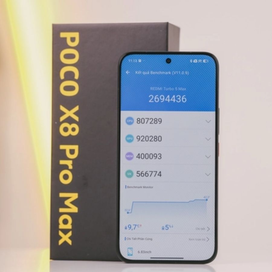 Điểm khiến mình tò mò nhất trên Poco X8 Pro Max chính là con chip MediaTek Dimensity 9500s. Đây là bộ vi xử lý được sản xuất trên tiến trình 3nm của TSMC với tốc độ xung nhịp tối đa tới 3,73 GHz. Theo công bố, máy đạt khoảng hơn 3 triệu điểm AnTuTu, một con số cực kỳ ấn tượng trong thế giới smartphone hiện nay.