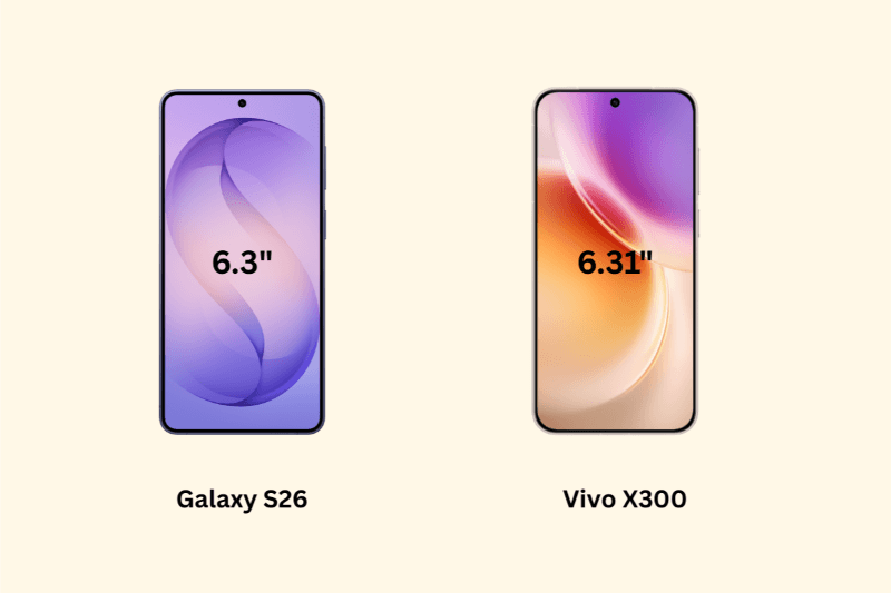 Cả Samsung Galaxy S26 và vivo X300 đều thuộc nhóm flagship nhỏ gọn khi cùng sở hữu màn hình khoảng 6.3 inch, mang lại sự cân bằng giữa trải nghiệm hiển thị và tính linh hoạt khi sử dụng.