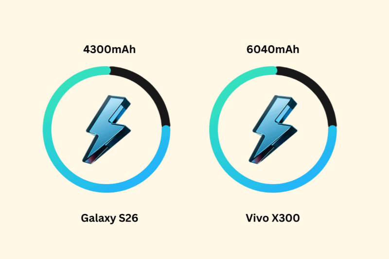 Có. Vivo X300 vượt trội rõ rệt với pin 6.040mAh và sạc nhanh 90W, phù hợp cho người cần dùng thời lượng dài và sạc nhanh. Galaxy S26 vẫn đủ dùng trong ngày, nhưng không phải điểm mạnh nếu so trực tiếp.