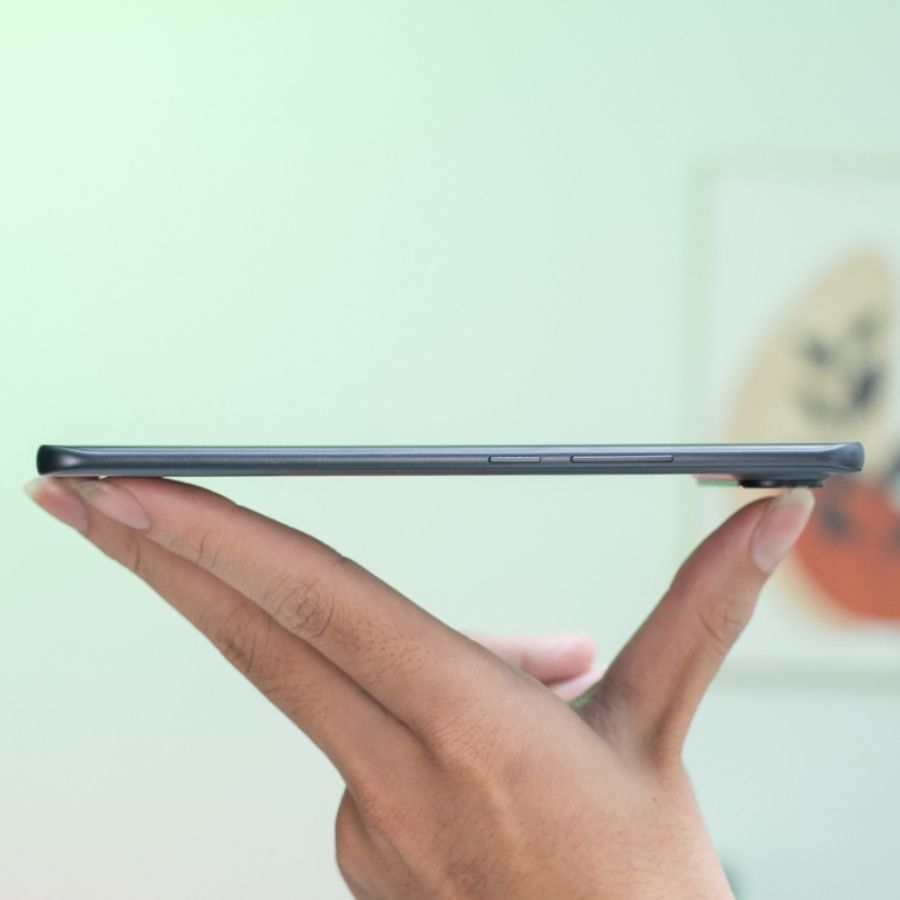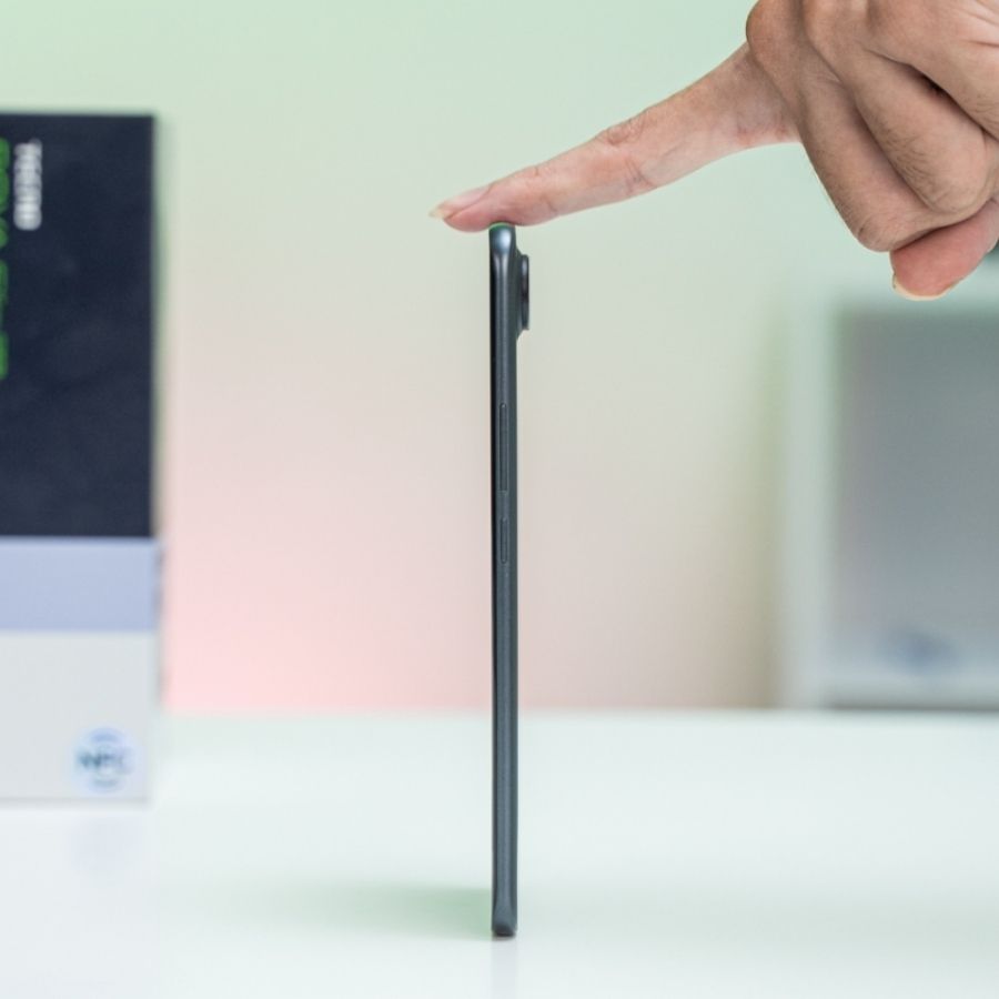 Ấn tượng đầu tiên khi cầm Pova Slim trên tay chính là độ mỏng đáng kinh ngạc chỉ 5,95 mm, cầm nắm rất nhẹ và thanh thoát, mang đến cảm giác hiện đại không khác gì một mẫu flagship cao cấp. Tuy mỏng nhưng máy vẫn cho cảm giác chắc chắn, liền lạc nhờ vào khung viền cứng cáp và lớp hoàn thiện nhám nhẹ ở mặt lưng, hạn chế bám vân tay.